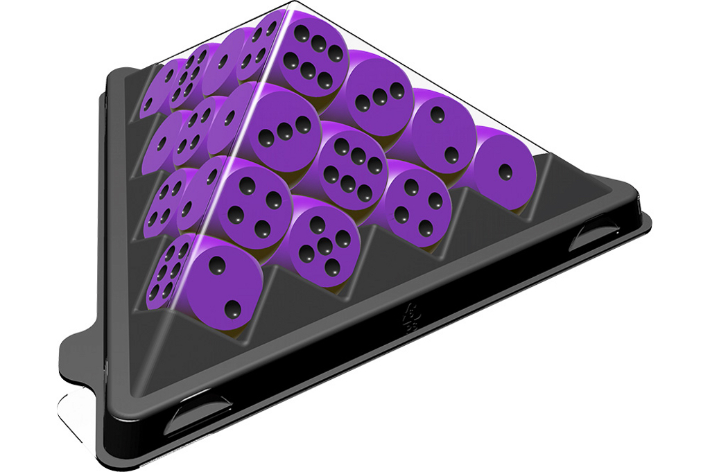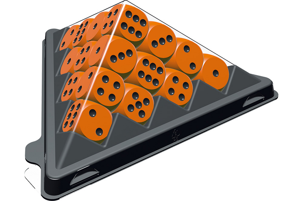 20 Würfel Kunststoff SAN in violett, orange oder grün. In Pyramidenbasis mit Abdeckung PET. 13,5*6 cm.