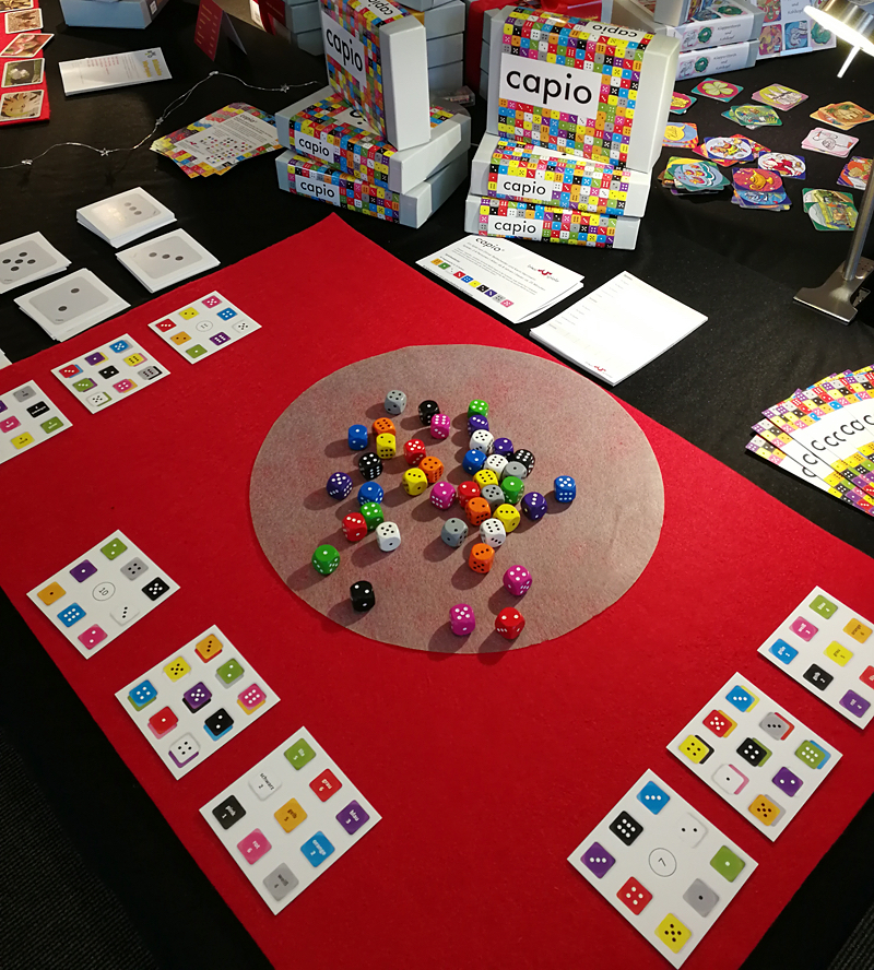 Das Würfel-Ablegespiel ist ein schnelles Familienspiel. 40 bunte Würfel liegen in der Tischmitte. Jeder Spieler hat drei Aufgabenkarten vor sich liegen und muss diese aus dem Würfelvorrat in der Tischmitte befüllen. Alle spielen gleichzeitig. Jede Karte hat dabei noch besondere Aufgaben. Wer kann die meisten Würfel auf seinen Karten platzieren?