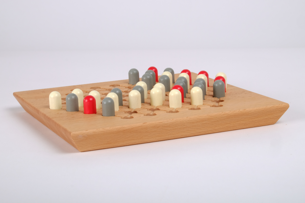 Spielsteine sind Holzstecker in rot, weiß und grau, 6 Türme + 2*25 Stecker, Ahorn farbig lackiert. Spielbrett Buche massiv gedämpft. 20*20 cm.