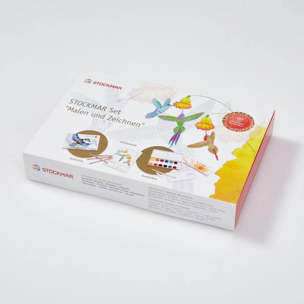 Das Geschenkset enthält ein Buntstifte Set mit Bleistift, einen Deckfarbenkasten und einen Zeichenblock. Das Geschenkset ist auch mit Stiften in dreieckform erhältlich.