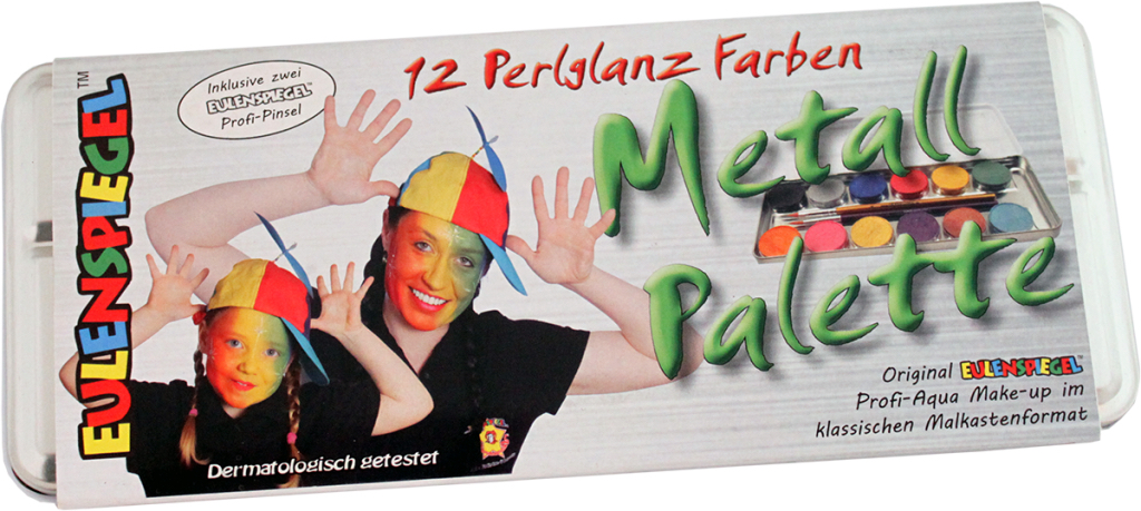 Die Schminkfarben sind von sehr guter Qualität, lassen sich gut auftragen und halten auch gut auf der Haut. Trotzdem lassen sie sich einfach mit Wasser und Seife wieder abwaschen. Die Farben enthalten weder Parfümstoffe noch Parabene, sind glutenfrei und werden ohne den Zusatz gesundheitlich bedenklicher UV-Filter hergestellt; dadurch mindern sie das Risiko von Allergien. In der Metall-Palette ist eine praktische Zusammenstellung von Perlglanz Farben im klassischen Malkastenformat enthalten (zum Nachfüllen geeignet).