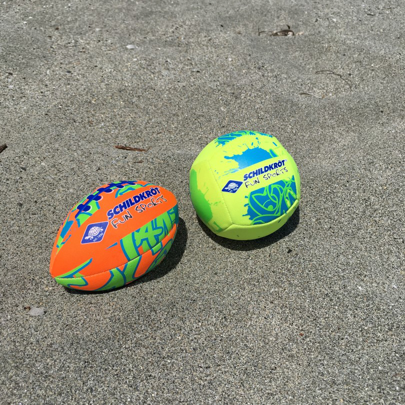 Im Doppelpack ist ein Mini-Beachvolleyball und ein Mini-American Football enthalten. Der Volleyball ist duch seinen Kern aus EPS leicht und springt auf der Wasseroberfläche. Der Football ist wattiert, saugt sich mit Wasser voll und ermöglicht so andere Spiele. Die kleinen Bälle sind gut für Kinderhände und auch für das Schwimmbad geeignet.