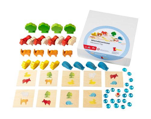 9 beidseitig bedruckte Karten, Birkensperrholz, 24 Aufstellfiguren (je Motiv 4 Stück), Buche bunt gebeizt + lackiert, 20 Glasnuggets, 1 Farbwürfel Kantenlänge Holzkarte 8 cm, Kantenlänge Würfel 1,5 cm, Glasnugget ca. Ø 1,8 cm, Baum 6 cm.