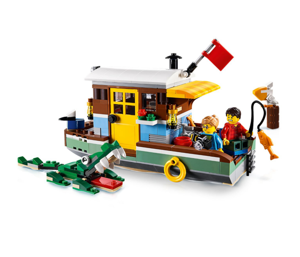 Creator 3 in1-Model. Das Hausboot kann in ein Wasserflugzeug mit Dock und Krabbe oder ein Fischerdorf mit Anlegestelle, Café und Fischerboot umgebaut werden. Das Hausboot verfügt über eine detailreiche Kabine mit Stuhl, Bett, TV-Gerät, Lampe und Küchenbereich sowie über einen detaillierten Deckbereich mit zwei Markisen, einem Schaukelstuhl, einer Werkbank, einer montierten Angelrute und vier Lampen. Enthält je eine baubare Vogel-, Pelikan- und Krokodilfigur. Zubehör: 1 Kamera, 3 Rettungsringe und 2 Fische.