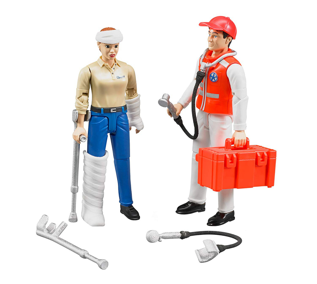 Der Sanitäter mit Cappie und die Frau in blauer Hose und Schuhen sind im Maßstab passend zur Profi-Serie und 3-dimensional beweglich. Die Hände können Gegenstände greifen oder sich an Fahrzeugen festhalten. Im Set enthalten sind noch ein Rettungskoffer, Stethoskop, Blutdruckmessgerät, Kopfverband, Gipsverband für Arm und Bein und Gehhilfen.