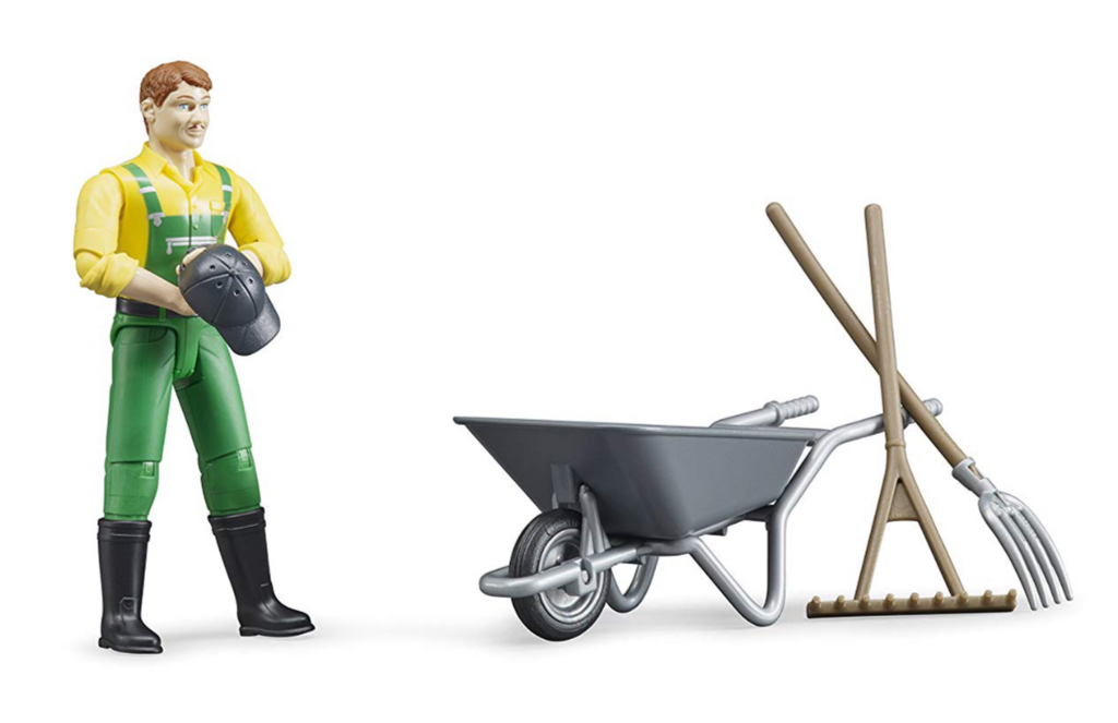 Der Landwirt in Latzhose und mit Cappie ist im Maßstab passend zur Profi-Serie und 3-dimensional beweglich. Die Hände können Gegenstände greifen oder sich an Fahrzeugen festhalten. Enthalten sind noch ein Besen, Mistgabel und Schubkarre.
