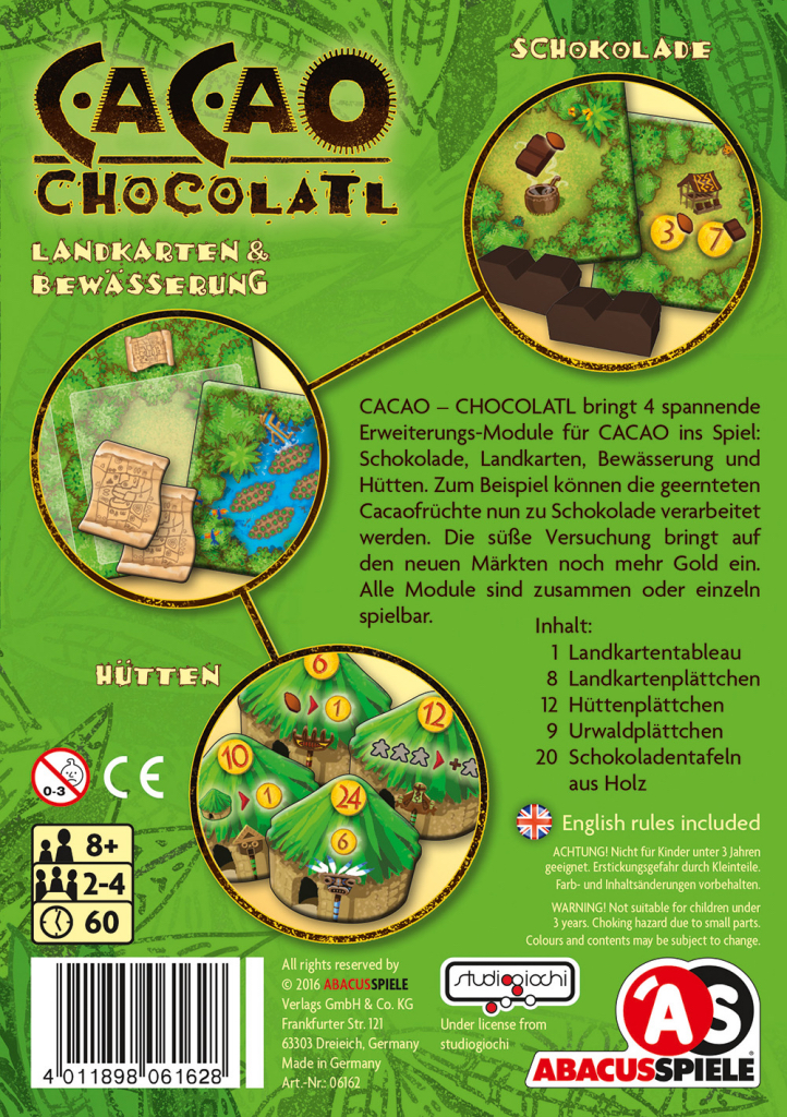 44 Arbeiterplättchen, 4 Wasserträger, 4 Dorftableaus, 8 Urwaldplättchen, 20 Cacaofrüchte, 12 Sonnensteine, 48 Goldmünzen. Erweiterung: 1Landkartentableau, 8 Landkartenplättchen