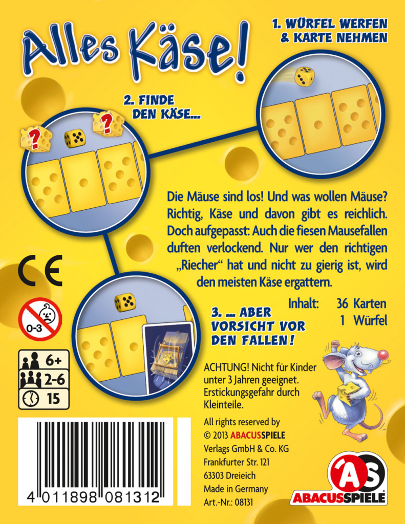 36 Karten: Rückseite je 6 mit 1-6 Käselöchern, Vorderseite 18 Käsekarten, 18 Fallenkarten.