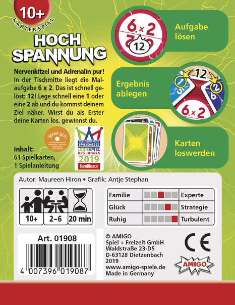 Bei diesem Spiel mit einem hohen Glücksfaktor sind auf den Spielkarten einfache Multiplikationsaufagen. Es geht es darum, die Mal-Aufgabe der in der Tischmitte liegenden Karten zu lösen. Anhand der Lösung können Karten mit entsprechenden Ziffern abgelegt werden. Da es keine Reihenfolge gibt, darf der schnellste Spieler eine passende Karte ablegen. Wer als erster keine Karte mehr hat, hat gewonnen.