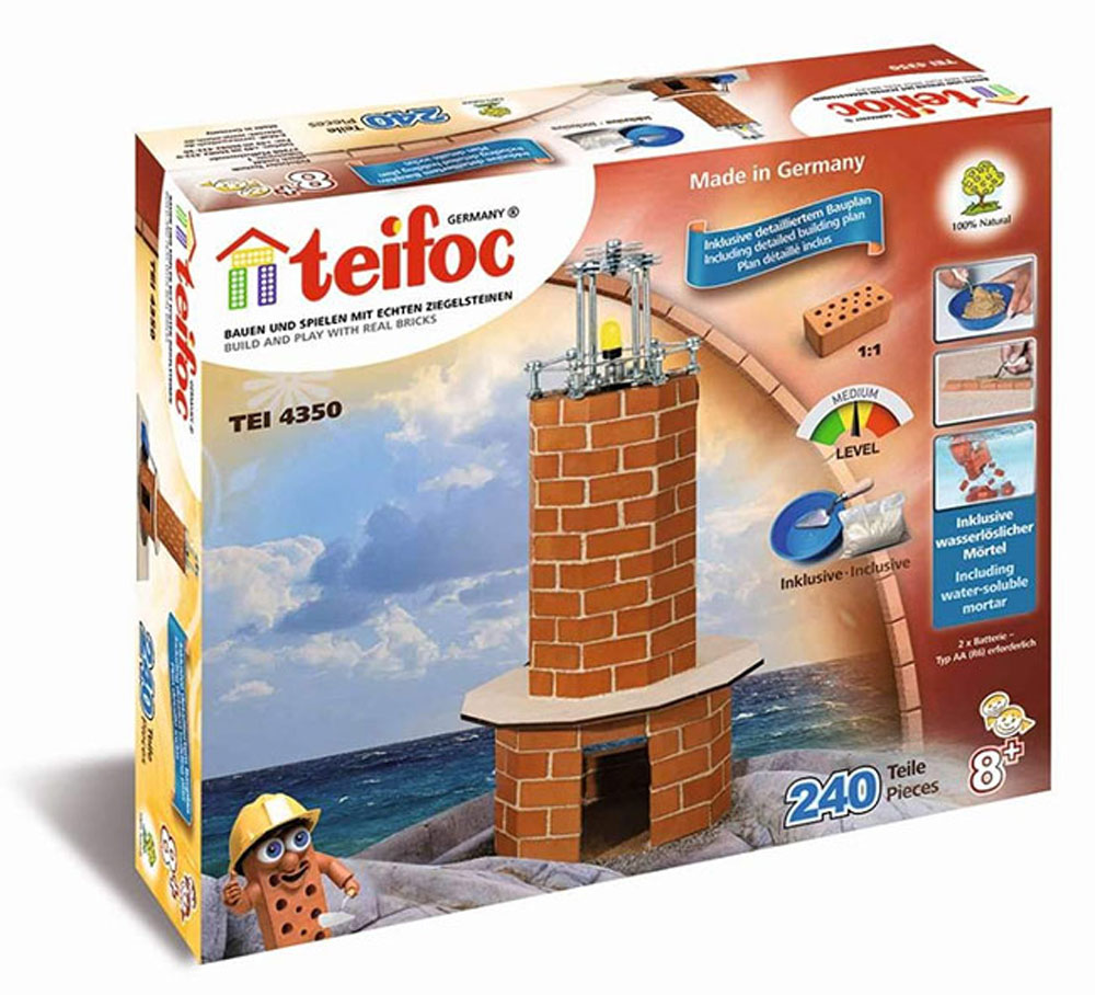 Mit dem Material und der ausführlichen Bauanleitung kann ein Leuchtturm gebaut werden. Alles was für den Bau nötig ist, ist enthalten: Maurerkelle, Mörtel, Mörtelschale und Ziegelsteine. Holzplatten und viele Metallbaukasten Teile sorgen für einen Leuchtturm-Abschluss. Der Turm kann jederzeit wieder zerlegt werden, wenn er in ein Wasserbad gelegt wird. Der wasserlösliche Mörtel macht eine Wiederverwendung der Einzelteile möglich. Diese können für den Modellbau verwendet werden, denn die Baukästen sind untereinander kompatibel. Für diesen Modellkasten ist Vorerfahrung nötig, deshalb steht auf der Verpackung auch der Hinweis: Lever - high bzw. Profi.