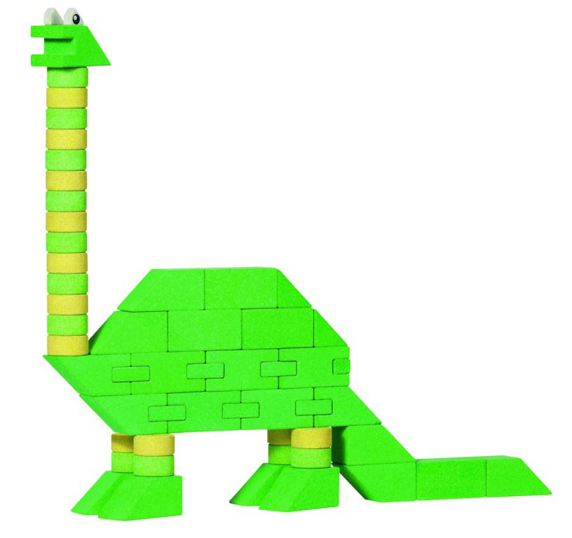 Die Steine in sattem grün und gelb und in verschiedenen Formen regen zum freien Bauen und Gestalten an. Durch die raue Oberfläche und das Eigengewicht lassen sich die Steine gut zu einem Bauwerk verbauen. Die Vorlage mit Dinosauriern geben Anregungen. Diese sollten aber nicht so verstanden werden, nur nach Vorlage zu bauen. Die Steine nach Vorlage wieder in die Holzkiste einzuräumen ist fast wie ein Puzzlespiel. Der gefüllte Kastens ist sehr schwer.