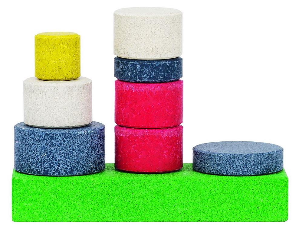 Grundplatten-Stein: 7,5*2,5 x 1,25 cm, 9 Steine in 4 Farben und 5 Größen.