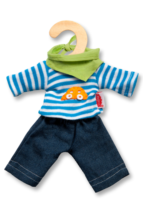T-Shirt: 100% Polyester, Jeans: 65% Baumwolle, 35% Polyester, Halstuch 100% BW. Mit Holzkleiderbügel. Für Puppengröße 20-25 cm + 28-35 cm + 35-45 cm.