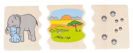 Die Kiste enthält 10 dreiteilige Bildfolgen mit je einem Tier, seinem Lebensraum und seinen Spuren. Die Puzzleränder stellen die Erfolgskontrolle dar: nur eine Variante der Zähnchen passt. Mit der Zeit kennen die Kinder natürlich die Lösungen, werden es mit zeitlichem Abstand aber gerne immer wieder puzzeln. Besonders für Institutionen geeignet.