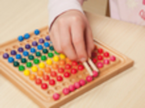 Bei diesem Legespiel werden Kugeln mit der Pinzette in die Mulden der Legeplatte gelegt. Auf der einen Seite sind die Kugelmulden in Reihen, auf der anderen Seite versetzt angeordnet. Die Vielzahl der Möglichkeiten macht das Spiel immer wieder interessant. Die Kinder entwickeln die Muster weiter, sowohl in der Farbgestaltung als auch in der Fläche oder auch in die Höhe. Das Legen mit der Pinzette erfordert ein konzentriertes Arbeiten und schult die Feinmotorik.