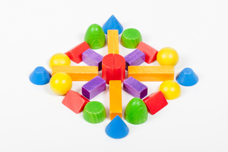 bunte Bausteine in einem Baukasten oder als Puzzle in den verschiedensten Formen in einem Rahmen bespielt oder verbaut werden.
