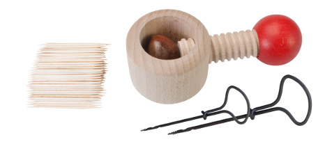 Kastanien unterschiedlicher Größen können in den Kastanienhalter Schraubstock eingeschraubt werden. So wird ein Wegrutschen der Kastanien beim Anbohren verhindert. Der Kastanienhalter eignet sich besonders für das Basteln mit Kindern. Die Bohrer sind unterschiedlich groß. Der Kastanienhalter ist auch extra erhältlich.