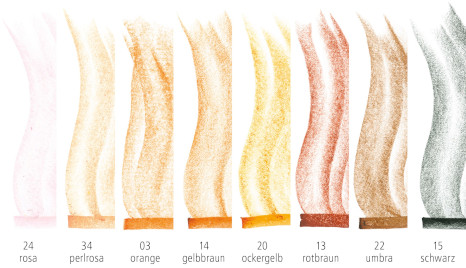 8 Blöcke: rosa, perlrosa, orange, ockergelb, gelbbraun, rotbraun, umbra, schwarz. Im Metalletui.