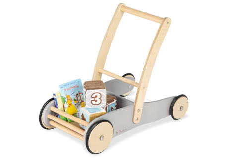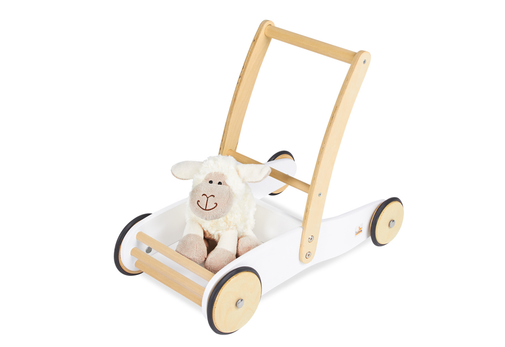 Buche massiv, Buche-Schichtsperrholz, natur oder weiß. Bereifung TPE. Stahlachsen + Metallteile Stahl verzinkt. 56*32 cm. Höhe des Schiebegriffs 45 cm.