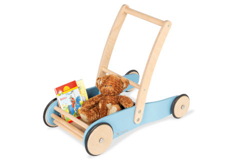 Der Wagen zum Schieben ist für Kinder gedacht, die gerade Laufen lernen. Durch die Verlagerung des Schwerpunkts zur Mitte des Wagens hin ist er kippsicher. So hat das Kind beim Schieben genügend Halt und kann auch sein Spielzeug und andere Dinge spazieren fahren. Der Lauflernwagen hat ein Bremssystem, so dass er nicht zu schnell davon rollt. Die Bremswirkung lässt sich durch die Bremsstange aus Rundstahl mit Kunststoff-Endkappen einfach stufenlos und werkzeugfrei einstellen.