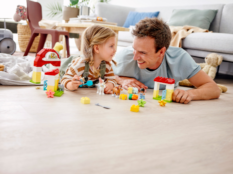 Der übersichtliche Inhalt und die großen Teile sind für jüngere Kinder ein Einstieg in die Welt des Spielens und Konstruierens. Das Set beinhaltet einen baubaren Stall mit aufklappbaren Türen, einen Jungen und ein Mädchen, zwei Ponys, einen Wassereimer, Karotten und einen Heuballen.