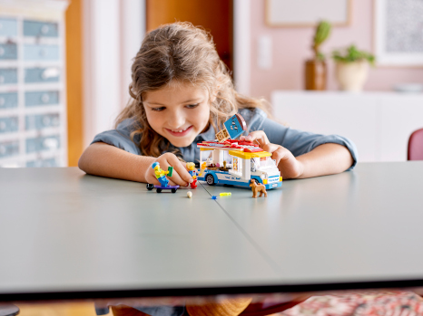Konstruktions - Spielset mit wenigen Bauschritten. Die Eisverkäuferin hat Platz im Eiswagen, so dass mit der zusätzlichen Figur und dem Zubehör Rollenspiele möglich sind. Die Anleitung ist übersichtlich in einzelne Bauschritte eingeteilt.