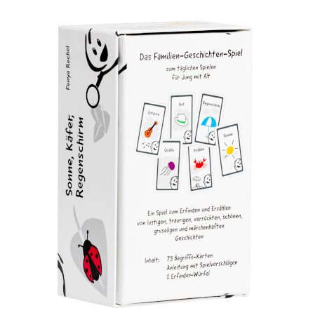 Die Begriffskarten regen zum Erfinden und Erzählen von lustigen, traurigen, verrückten, schönen usw. Geschichten an. Dazu werden gie gemischten Karten auf einen Stapel gelegt. Der erste Spieler zeiht drei Karten und legt sie offen vor sich hin. Nun soll dazu eine Geschichte erfunden werden, in der die drei Begriffe vorkommen. Als Variante geben die Würfel vor, ob die Gesichte lustig, traurig, verückt usw. werden soll. Das Spiel enthält weitere Varianten.