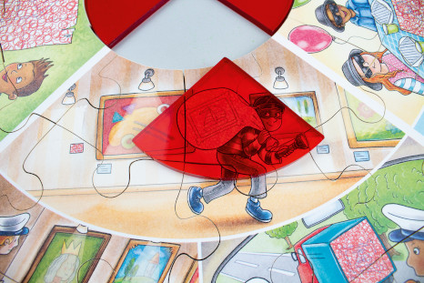 Bei diesem runden Boden-Puzzle kann das rote Plexiglas in der Mitte heraus genommen werden. Wird es auf die Bereiche gelegt, die erst mal rot und undurchsichtig erscheinen, sind darunter Spuren zu sehen. Diese finden sich am Rand des Puzzles als Symbole wieder. Anhand dieser Symbole sollen die Spuren im Puzzle gefunden werden.