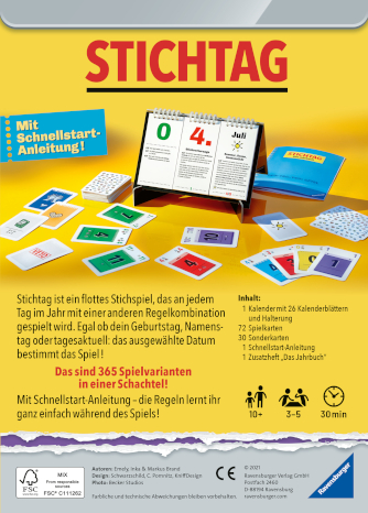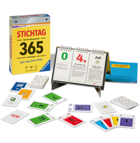 Stichspiel wie Skat, jeder Tag hat aber extra Regeln die aufeinander abgestimmt sind. Auf dem Tischkalender wird das gewünschte Datum (z.B. Geburtstag, Namenstag, Hochzeitstag usw) eingestellt , welches dann die drei Sonderregeln für das heutige Spiel bestimmt. Das sind dann 365 verschiedene Kartenspiele in einer Schachtel. Dank der Schnellstart-Anleitung kann es umgehend losgehen, denn alle weiteren Regeln werden während des Spiels gelernt.