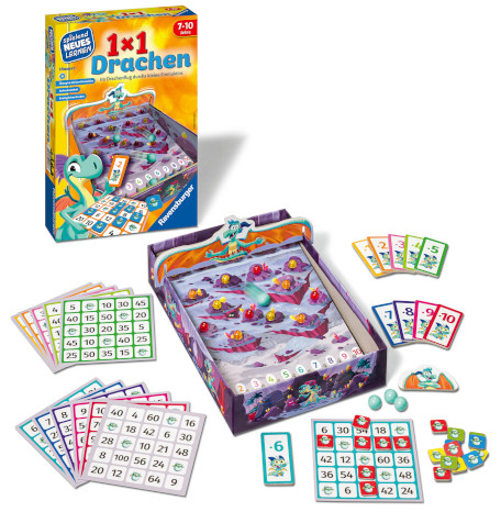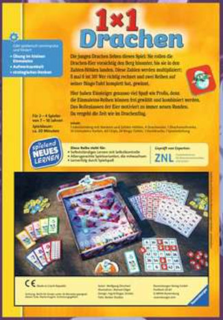Ziel des Spieles ist es, auf der eigenen Bingo-Tafel zwei Reihen zu füllen und damit zu gewinnen. Jeder Spielende wählt sich eine der 1x1 Reihen von 1-10 aus. So kann der Schwierigkeitsgrad selbst bestimmt werden. Die Dracheneier rollen in die nummerierten Drachenhöhlen. Reihum darf nun jeder Spielende ein Drachenei entnehmen und die Zahl mit seiner 1x1 Reihe multiplizieren und die entsprechende Zahl auf seiner Bingo-Tafel abdecken. Kinder die das kleine 1x1 noch nicht kennen, können die Reihen 1 oder 2 wählen. Ein Lernspiel, das wirklich Spaß macht.