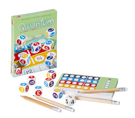 7 Würfel, 4 Stifte, 1 Spielblock.