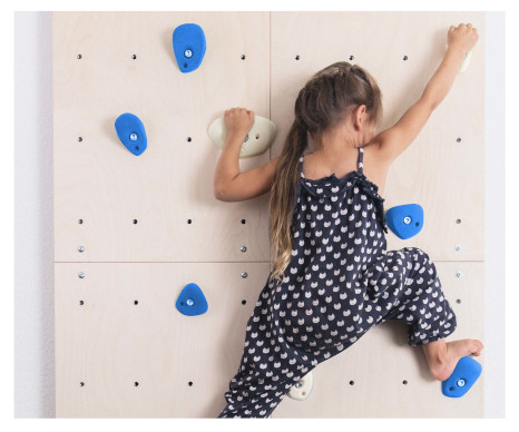 Die Kletterwand besteht aus sechs Modulen und ergonomischen, kindgerechten Klettergriffen, die individuell angeordnet werden können. Die sehr gute Qualität und hohe Wertigkeit bedeutet auch Sicherheit, da alle Teile stabil und haltbar sind. Die Raumhöhe muss beachtet werden und die Kletterwand ist so lange interessant, wie die Höhe interessant ist. Die Bouldergriffe können ganz flexibel angebracht werden, so ergeben sich immer neue Kletter-Routen. Eine Fallschutzmatte gibt zusätzliche Sicherheit. Für den Indoorbereich geeignet.