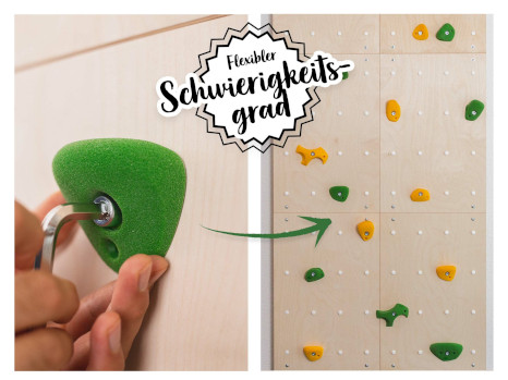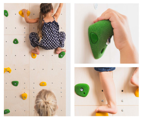 Eine Kletterwand besteht aus Modulen und ergonomischen, kindgerechten Klettergriffen, die individuell angeordnet werden können. Sehr gute Qualität und hohe Wertigkeit bedeutet