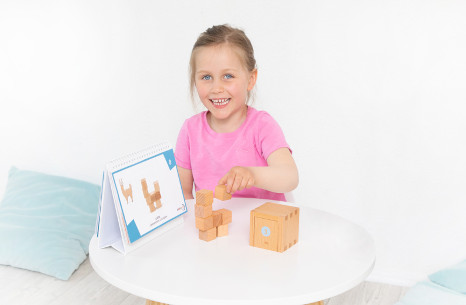 5 Holzboxen mit Schiebedeckel mit den Gaben 3-6 mit Würfeln, Plättchen, Dreiecken, Stäben. 5 Aufgabenhefte. 1 Anleitungsheft für die Gaben 1-6.
