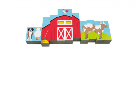 17 Teile: 5 x 12*3*3 cm bzw. 9*3*3 cm und 3 x 6*3*3 cm. 5 Vorlagenkarten beidseitig bedruckt. Holzsäulen vierseitg bedruckt.