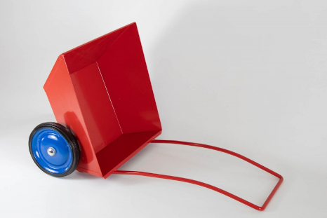 Metall pulverbeschichtet rot, Metallräder blau, Maximale Belastbarkeit 10 kg. 32*32*54 cm, Wanne 9 cm tief, Griffhöhe 54 cm, Gewicht: 2,3 kg.