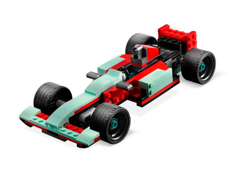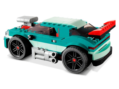 Creator 3 in1-Model. Die Packung enthält Anleitung für drei Modelle. Der Straßenflitzer seitliche Auspuffrohre, einen Heckspoiler und ein abnehmbares Dach. Das Auto kann in einen Rennwagen oder in dein Hot Rod umgebaut werden. Mit den Steinen aus diesem Set können junge Baumeister aber auch fantasievolle eigene Fahrzeuge erschaffen, wenn sie es schaffen, sich von den Bauanleitungen zu lösen.