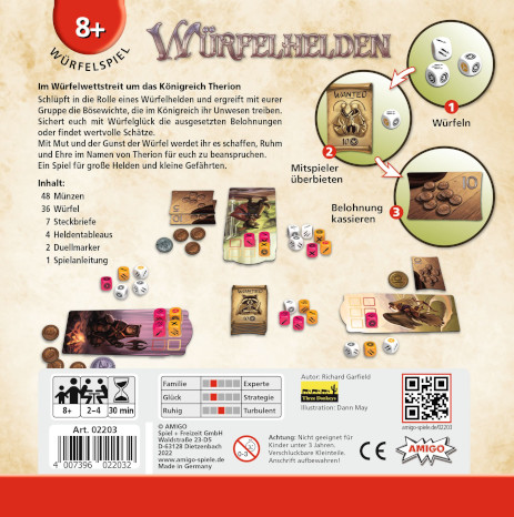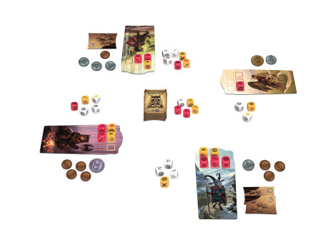 48 Münzen, 36 Würfel, 7 Steckbriefe, 4 Heldentableaus, 2 Duellmarker.