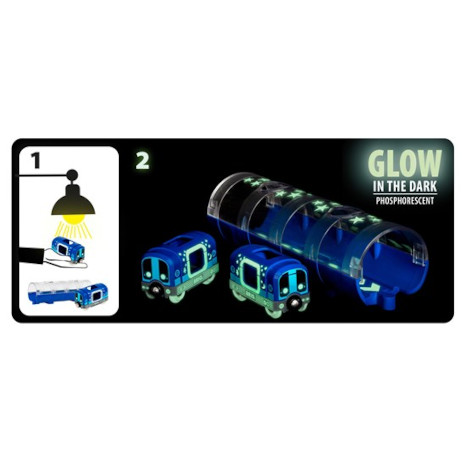 Erweiterung für die Holzschienenbahn, wenn sich das Spiel mit der Grundpackung usw. erschöpft. Die Verpackung der U-Bahn ist gleichzeitig ein durchsichtiger Tunnel, der mit anderen Schienen verbaut werden kann. Das Dach des Tunnels kann abgenommen werden. Zug und Anhänger verfügen über Magnetkupplungen. Das Dach von Lok und Waggon lässt sich öffnen und es finden zwei Figuren darin Platz. Die Tunnel Box und die U-Bahn leuchten im Dunkeln. Kompatibel mit allen Produkten der BRIO World.