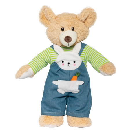 Ansprechend in Stoff und Muster und qualitativ hochwertig sollte gute Puppenkleidung sein. Dann bereichert jedes Stück das Spiel und beim An- und Ausziehen üben Kinder auch noch ihre Geschicklichkeit. Mit Klettverschluß an Ringelshirt und an den Trägern der Latzhose.