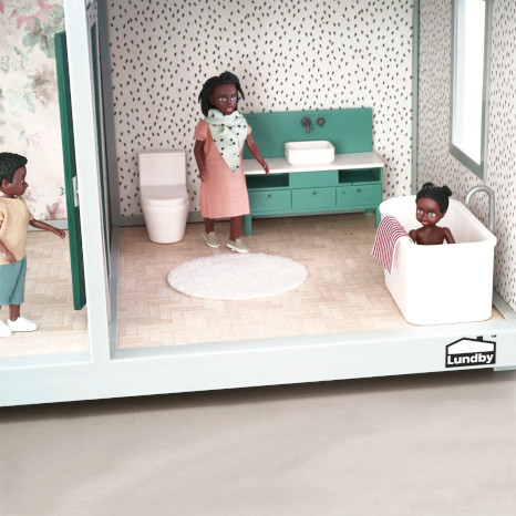 Das Badezimmer besteht aus einem Waschtisch mit zwei offenen Ablagefächern, einer Toilette mit zu öffnendem Deckel und einer Badewanne. Eine runde Badezimmermatte und ein Handtuch sind auch dabei. Die Kunststoffmöbel sind leicht, aber stabil und lassen sich einfach reinigen.