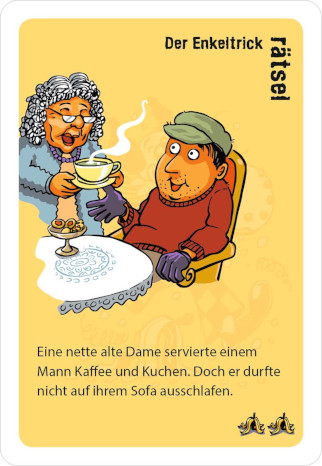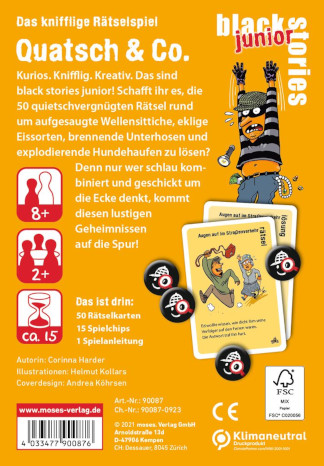 Ziel des Spiels ist es, mithilfe eines kurzen Rätsels auf der Kartenvorderseite einen Tathergang zu erraten ....also wie ist es zu der auf der Kartenrückseite beschriebenen Situation gekommen? Ein Spielleiter wird bestimmt der die Kartenvorder-und Rückseite genau studiert und danach das Rätsel den Mitspielern vorliest und Ihnen die Abbildung zeigt. Die Mitspielenden stellen nun Fragen und versuchen auf die Lösung zu kommen. Was ist geschehen? Wo? Wie? Wann usw...Mithilfe des Lösungstextes beantwortet der Spielleiter die Fragen. Bei "Quatsch & Co." geht es um eklige Eissorten, brennende Unterhosen, tollpatschige Verbrecher oder explodierende Hundehaufen. Alles etwas kurios – und teilweise schier unglaublich. Achtjährige verstehen manches noch nicht, deshalb ist es sinnvol die Karten vorher auszuwählen.