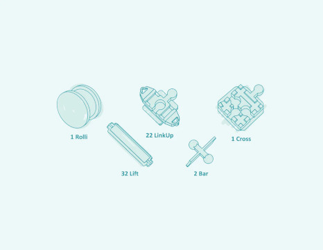 58 Teile, 22 LinkUp,1 Cross, 32 Lift + 2 Bar (Kunststoff). 1 Rolli (Holz) Ø 5 cm.
