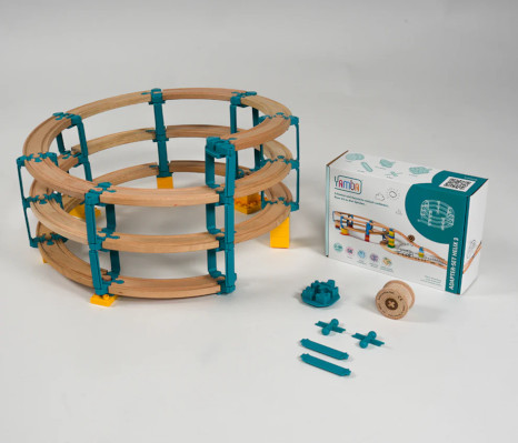 Die Verbindungselemente sind eine interessante und flexible Erweiterung für die Holzeisenbahn und kompatibel mit allen gängigen Holzschienen. Durch die Elemente kann leichter in die Höhe gebaut werden und auch eine Kugelbahn ist möglich.