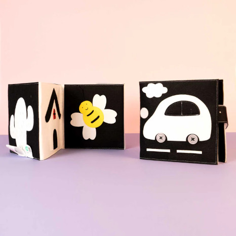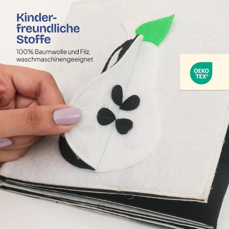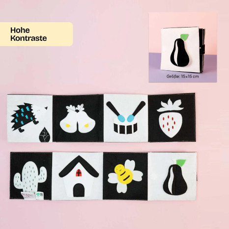 Das Büchlein besteht aus Filz, ist weich und trotzdem stabil. Die kontrastreichen schwarz-weiß Motive mit kräftigen Farbakzenten fördern die visuelle Wahrnehmung. Sobald das Baby greifen kann, kann es auch haptische Erfahrungen machen. Dazu sind einzelne Teile aufklappbar.