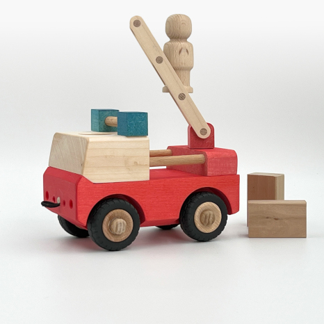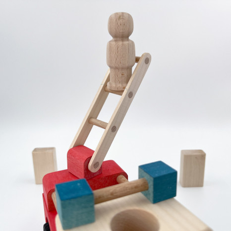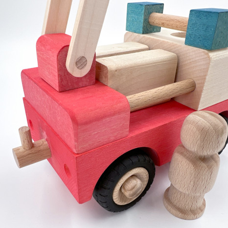 Das Feuerwehrauto ist robust, stabil und formschön. Die Kunststoffräder laufen geräuscharm und schonen den Fußboden. Als Anhängekupplung befindet sich vorne eine Schlaufe und hinten ein Holzstift. Die Leiter ist abnehmbar. Zudem gibt es eine Ansteckmöglichkeit für die Schneeschippe.
