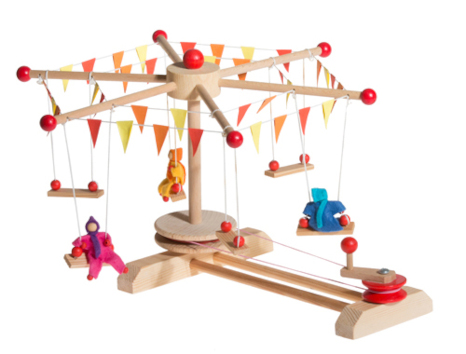 Der Bausatz enthält Material und Anleitung zum Bau eines Kettenkarussells, das mit einer Kurbel in Bewegung gesetzt wird. Der Zusammenbau erfordert Geduld und feinmotorisches Geschick, das erst ältere Kinder haben. Kinder ab 6 Jahren können damit spielen. Kann auch mit einem Wasserrad, einer Windmühle oder einem Motor betrieben werden.