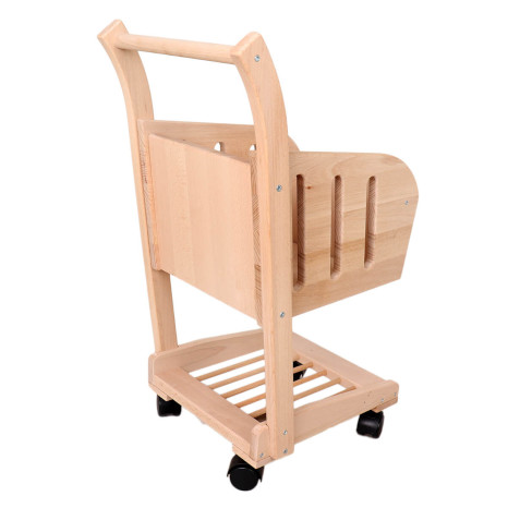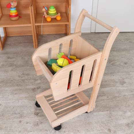 Der Einkaufswagen aus Holz kann in natur oder geölt ausgewählt werden und bietet tolle Möglichkeiten ins Rollenspiel einzutauchen. Die untere Ablage hat viel Platz, damit die Kinder größere Dinge verstauen können.