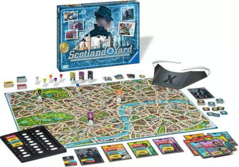 12 Spielfiguren (6 normale Spielfiguren und 6 Charakterspielfiguren) Kunststoff, 29 Startkarten, 130 Tickets: 57 Taxi, 45 Bus, 23 Underground, 5 Black-Ticket. 3 Doppelzugtickets, 10 Ticket-Tafeln, 2 Ticket-Tafeln für Ms.X + Mr. X. 1 Fahrtentafel, 1 Sichtschirm, 2 Ringe für die Bobbies, Spielplan 67*50 cm.
