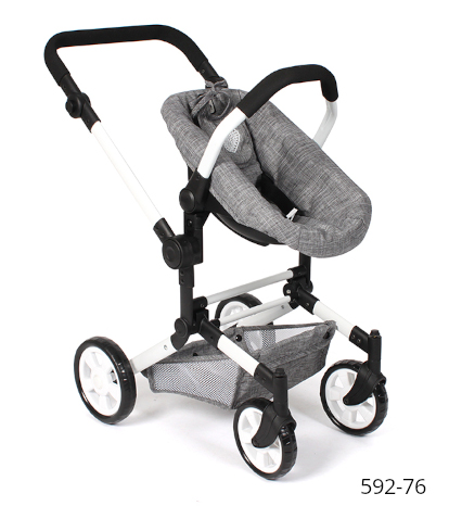 Stahlrohr, Bezugsstoff + Füllmaterial PE. Räder + Griffe EVA, PP. Verschiedene Designs, abwaschbar. Wendebügel-Schiebegriff ist höhenverstellbar von ca. 47 bis 78 cm. Für Puppen bis ca. 52 cm. Gewicht 4,1 kg. 72*41*82 cm. Im Set mit Autositz.